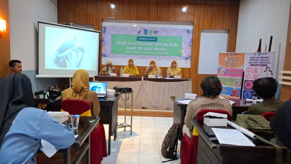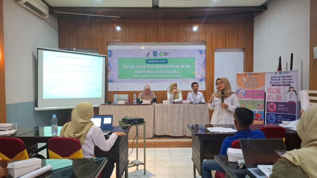 Dinas Kesehatan Kabupaten Dompu melalui bidang Pelayanan Kesehatan Seksi Farmakmin dan PKRT telah melaksanakan Bimtek Penilaian Mandiri Cara Produksi Pangan Olahan Yang Baik Bagi Industri Rumah Tangga Pangan (CPPOB- IRTP). Kegiatan ini berlangsung selama 2 hari dari tanggal 18-19 November 2025 bertempat di aula Hotel Tursina dan di hadiri oleh 68 peserta dari Pelaku Usaha IRTP.